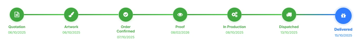 Every stage is timestamped and logged. Your portal shows a full timeline of your order's journey, when the artwork was sent, when you approved the proof, when it shipped, and when it arrived.