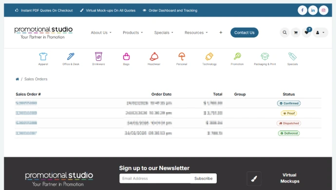 Once confirmed, your orders appear with their production status front and centre, from Order Confirmed through to Delivered.