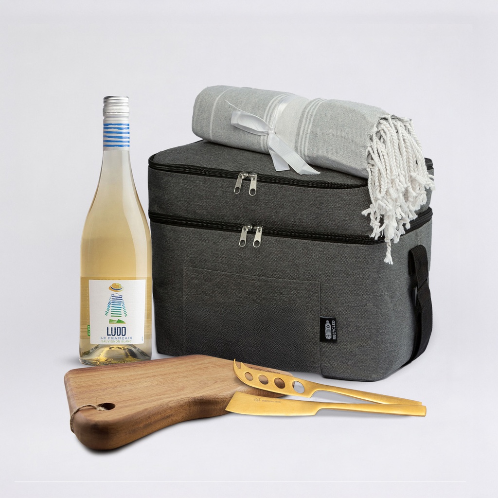 Cooler Bag: RPET Polyester 600D, PEVA Lining, PE Foam, Polyester Straps, Serving Board: Acacia Wood, Cheese Knifes: High-quality stainless steel, Turkish Towel: 100% cotton fibres