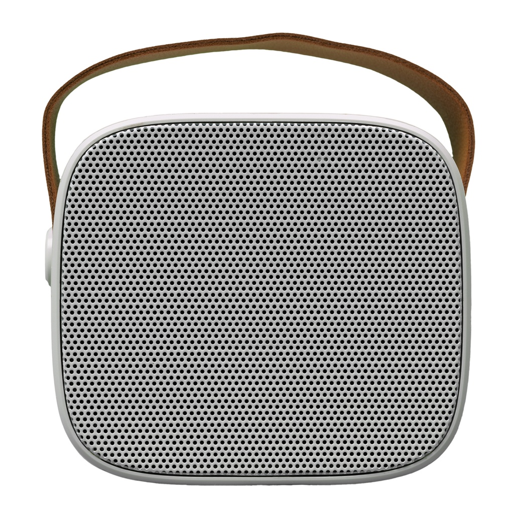 Stylish Aesthetic: Elegant white speaker with a brown PU strap for a modern look.