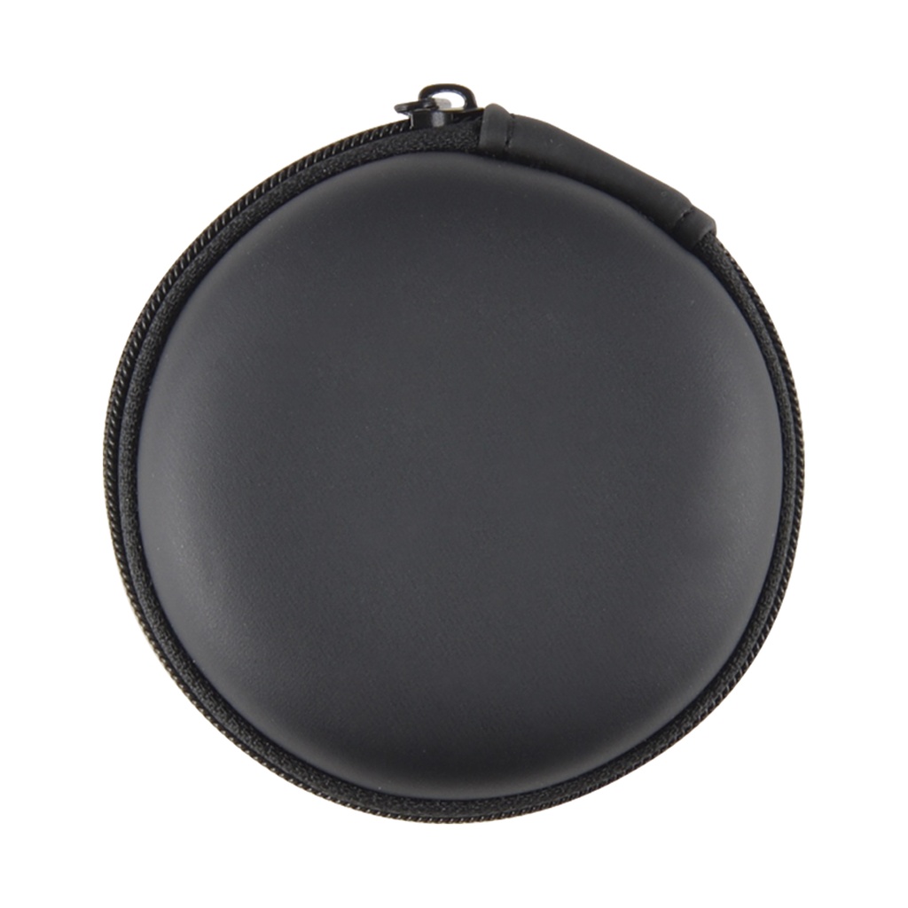 Stylish Storage: White earbuds in a round black EVA zippered case.